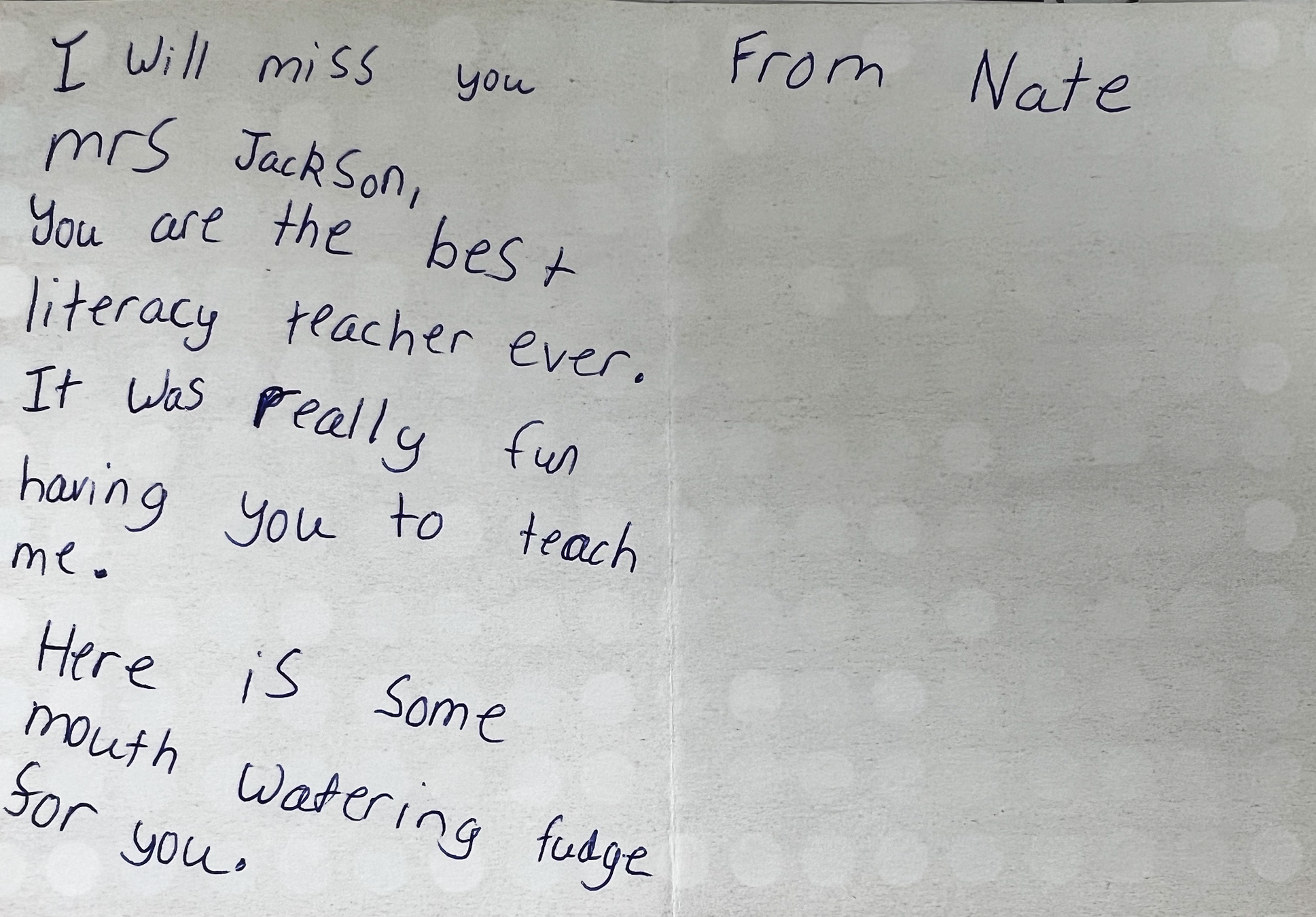 “I will miss you Mrs Jackson, you are the best literacy teacher ever. It was really fun having you to teach me. Here is some mouth watering fudge for you.”